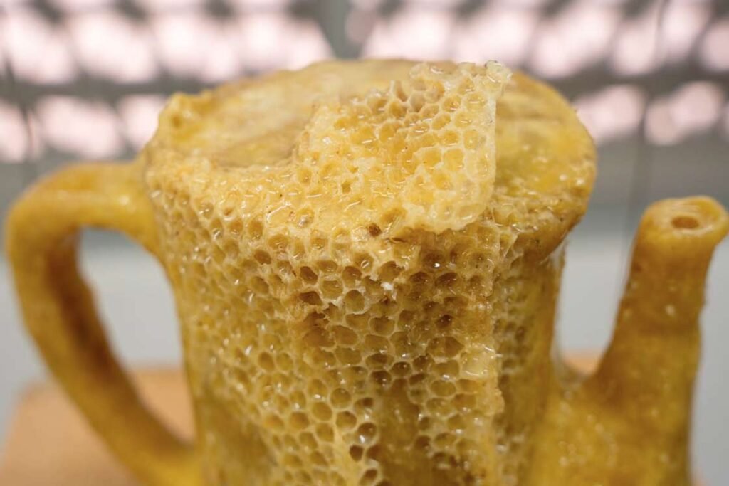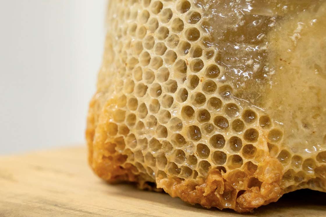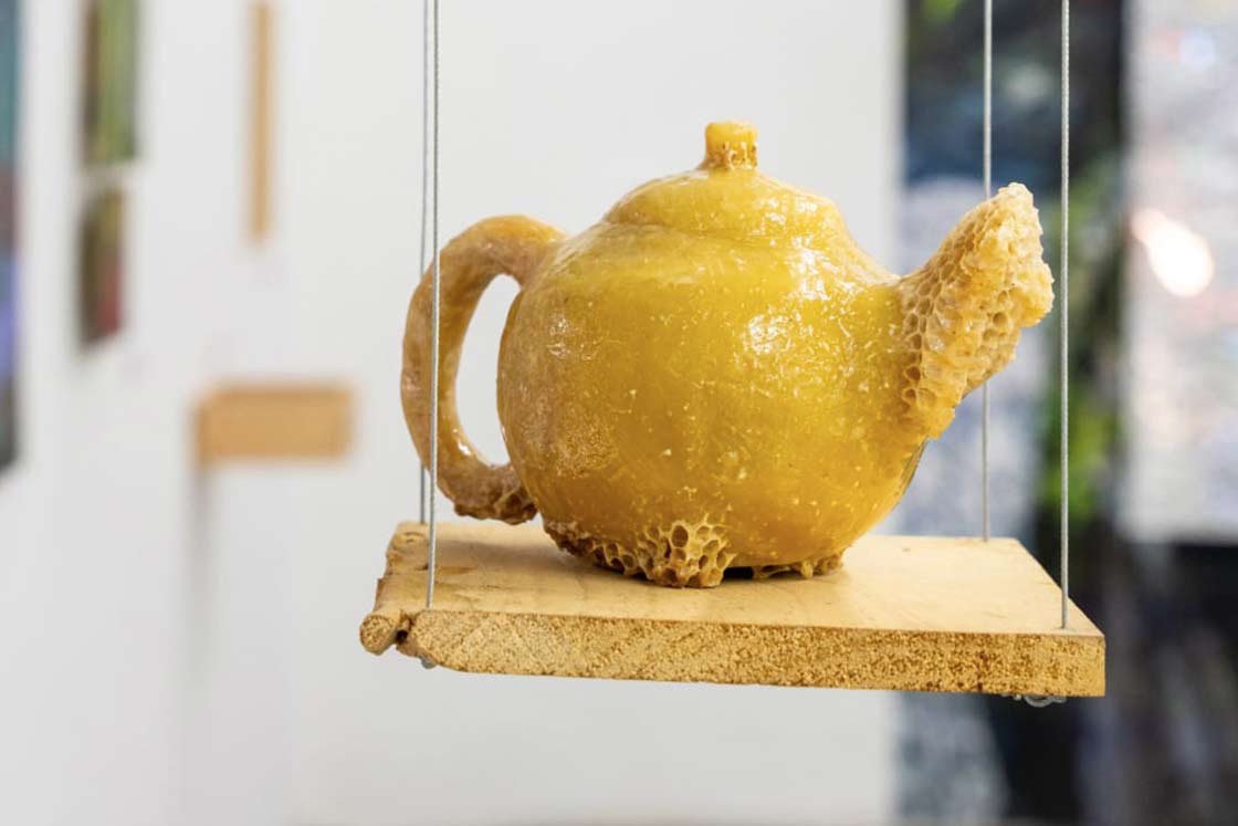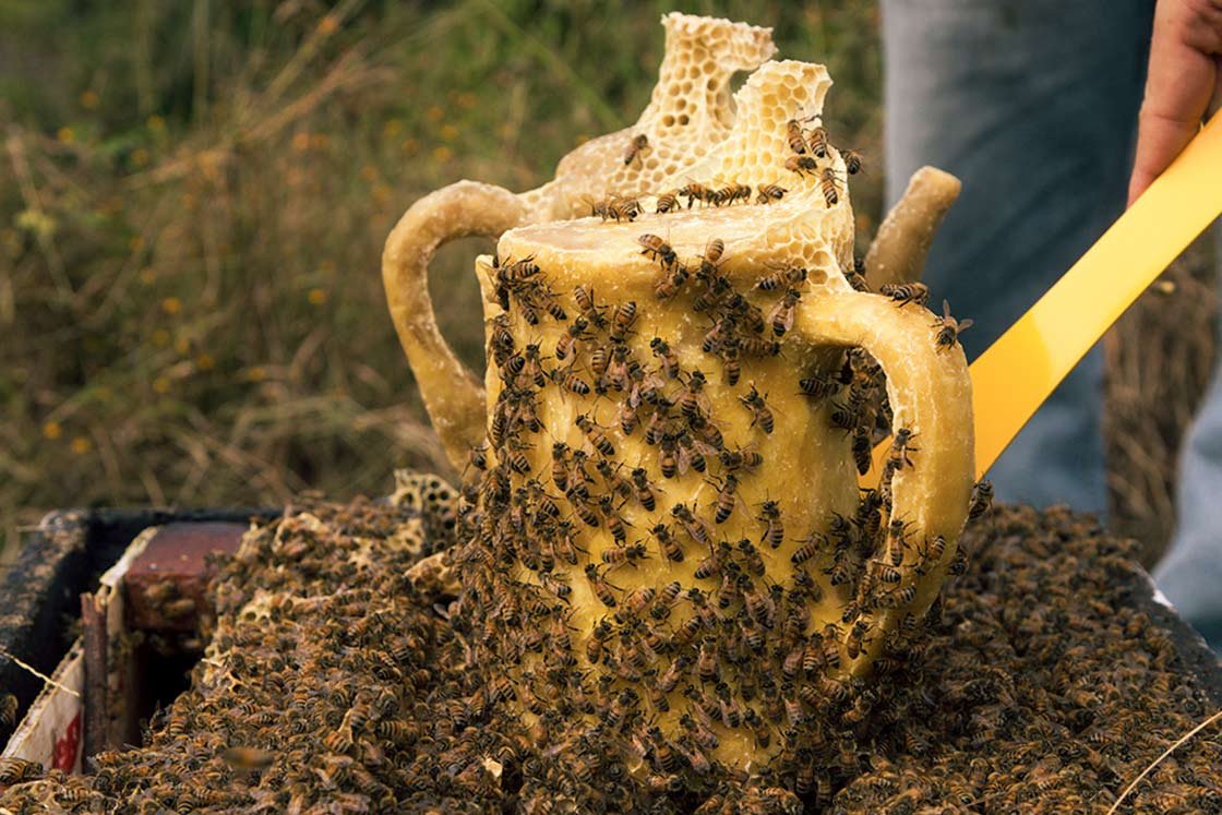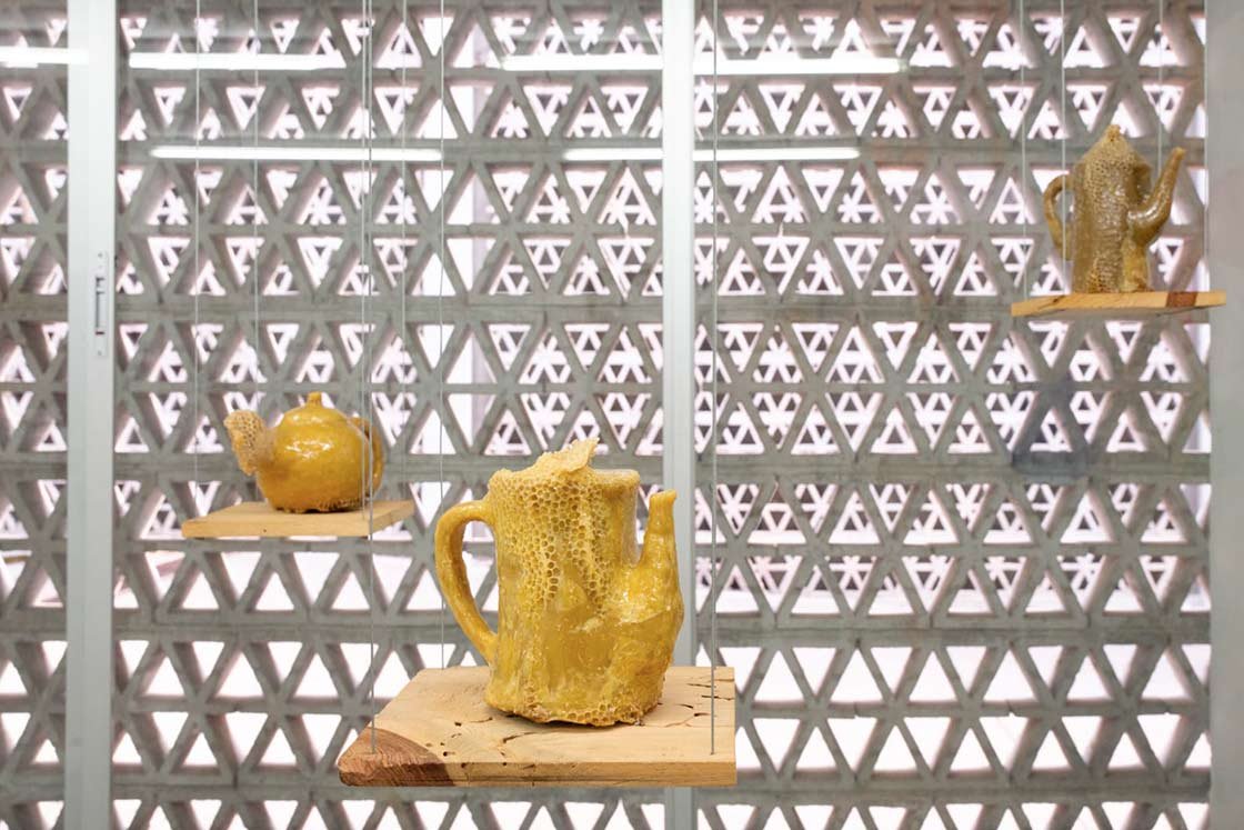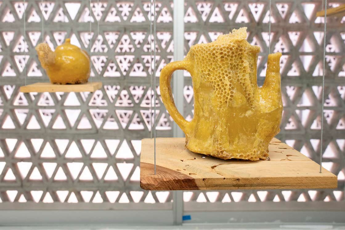 COFFEE TALKS Beewax sculptures carved by the artist are transformed through inhabitation and time, recording traces of proximity and coexistence between humans and bees.